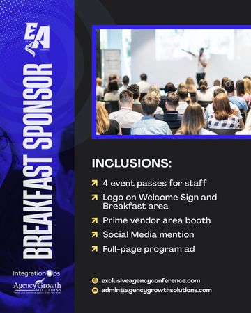 Breakfast Sponsor at EA CON 2026 featuring breakfast area branding, vendor booth exposure, social promotion, and visibility at Exclusive Agency Conference 2026.